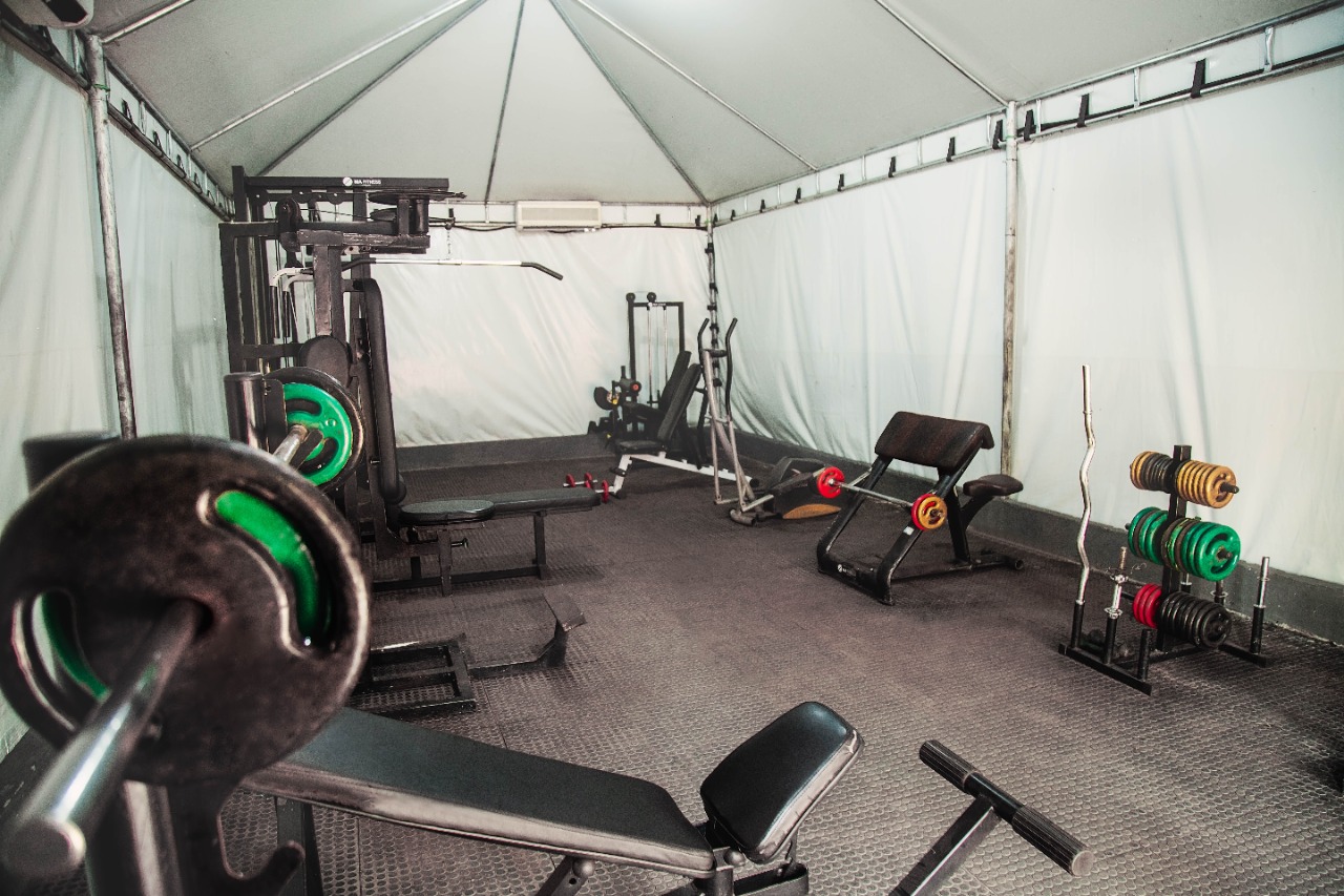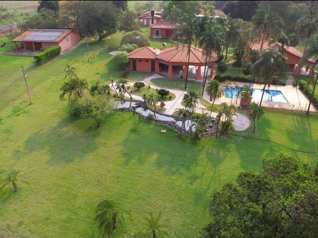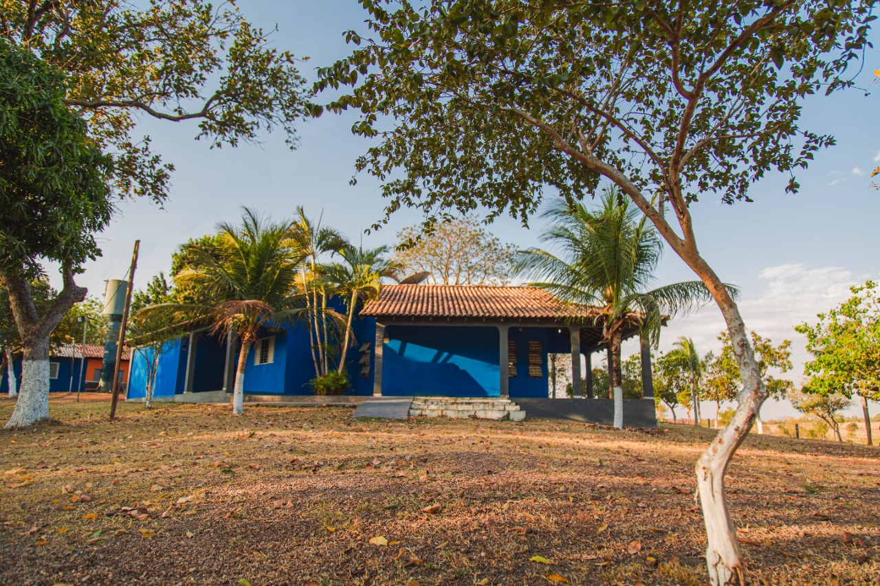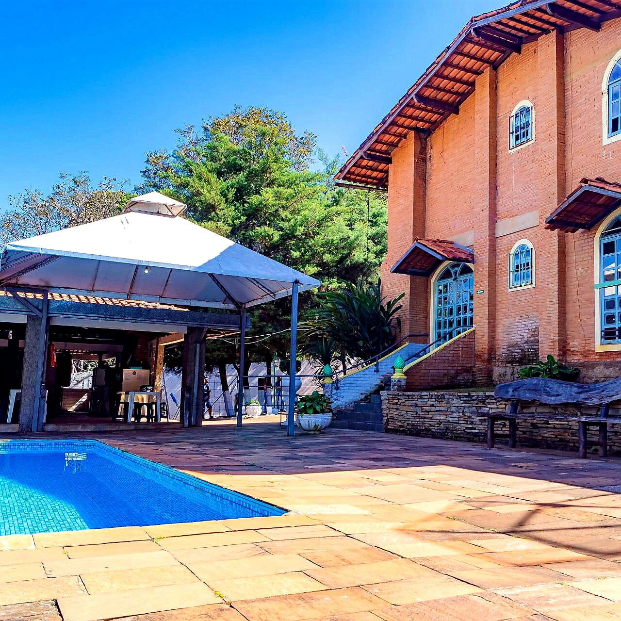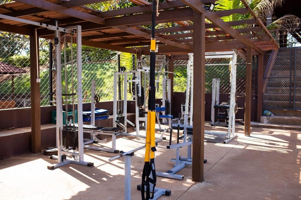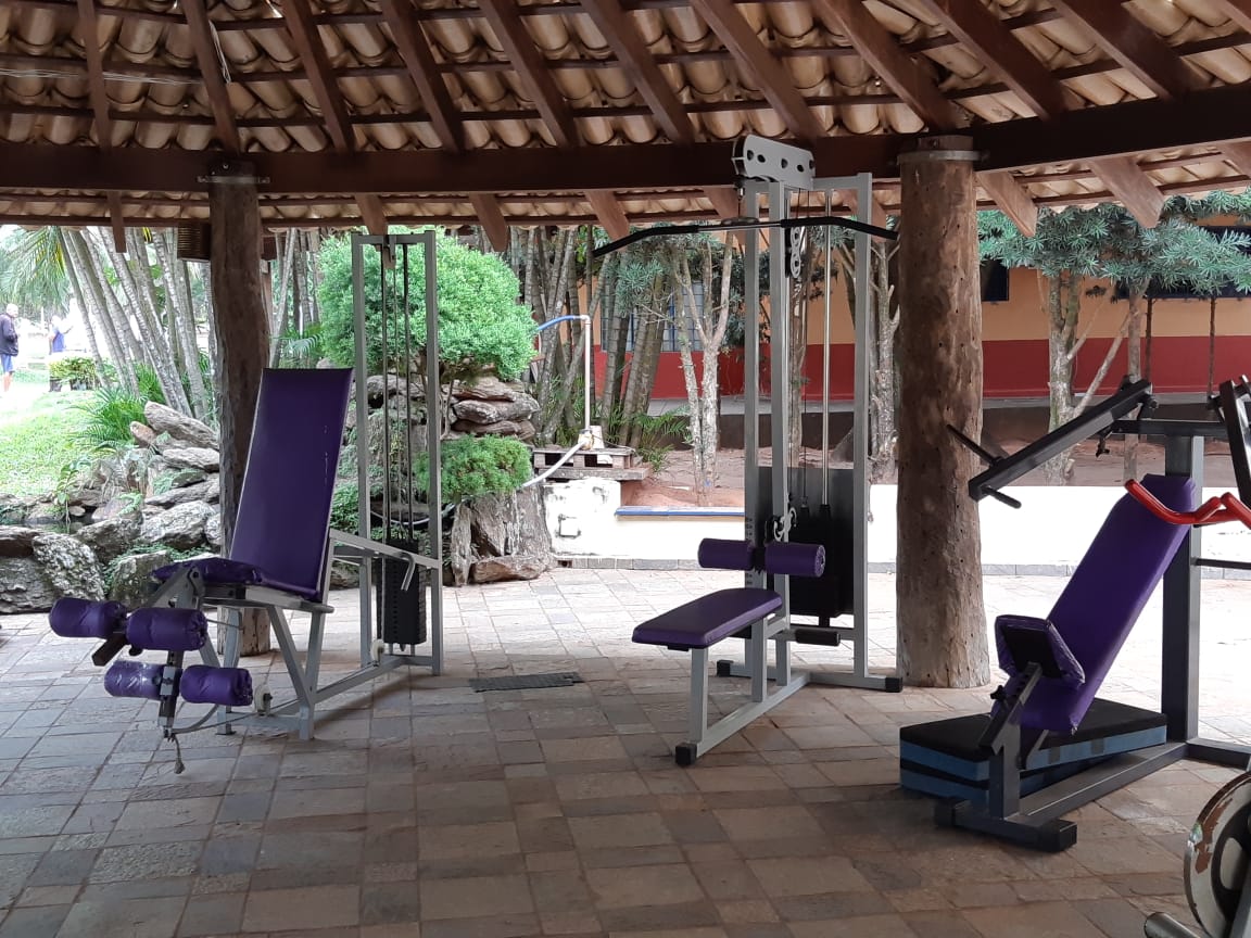 Ambientes equipados com piscina, academia, campo e quadra para esportes, refeitório, além de uma área ampla.