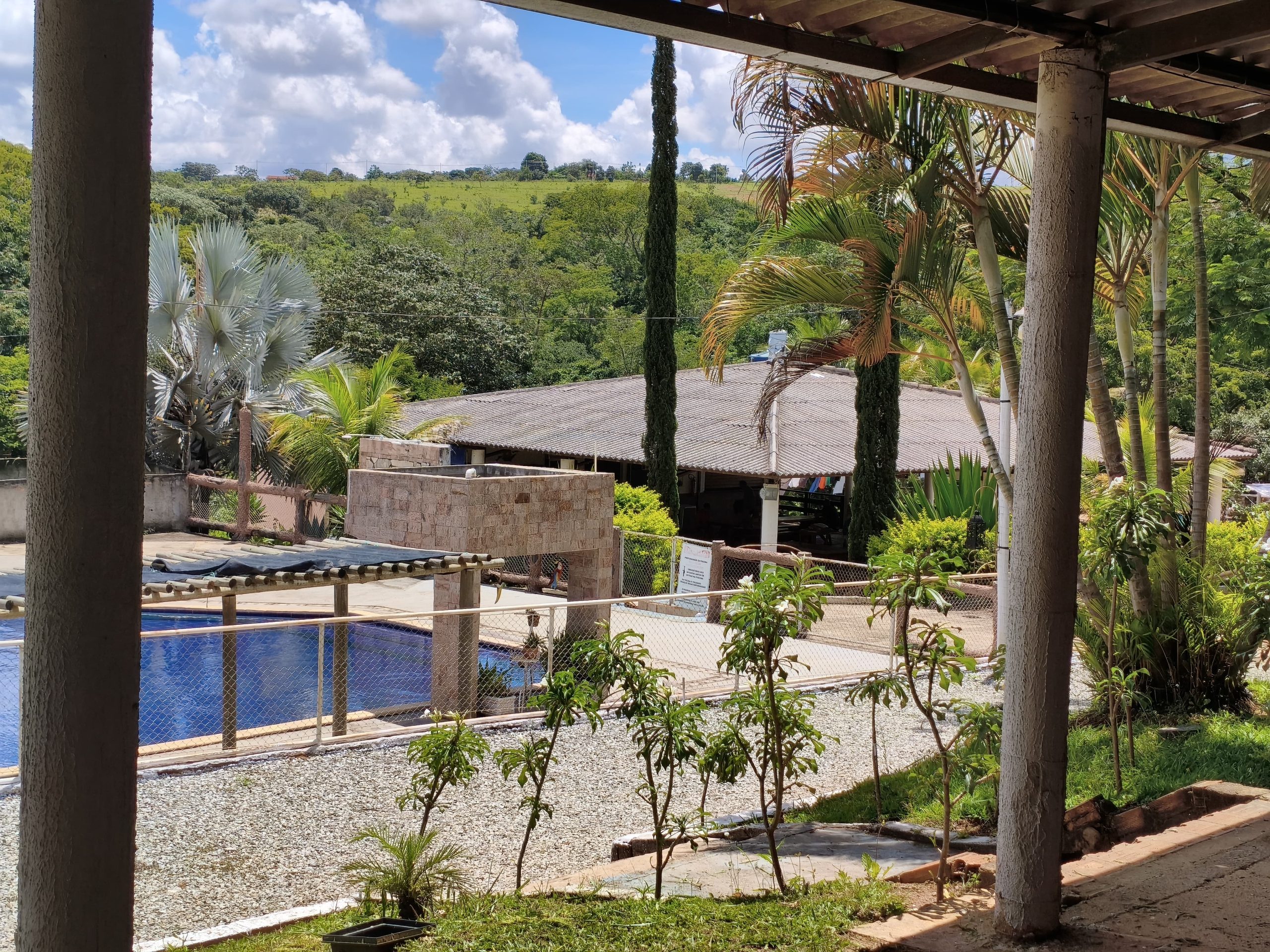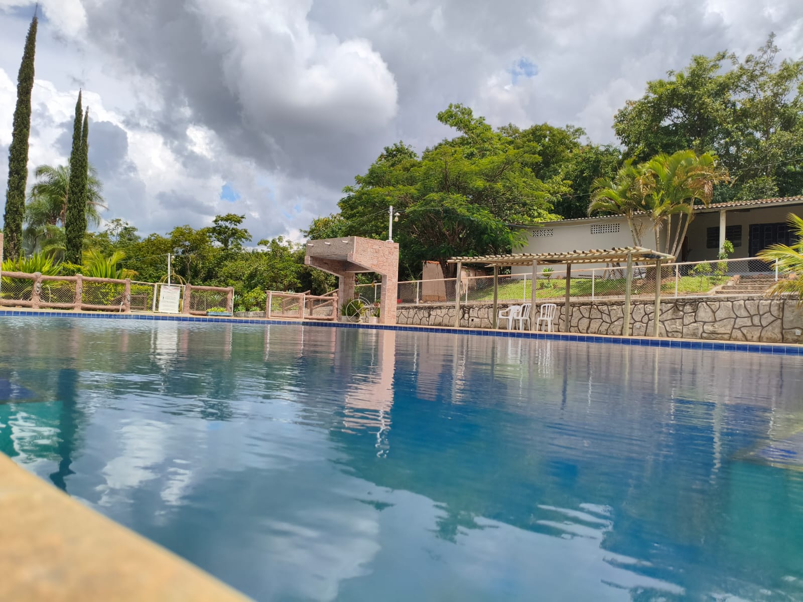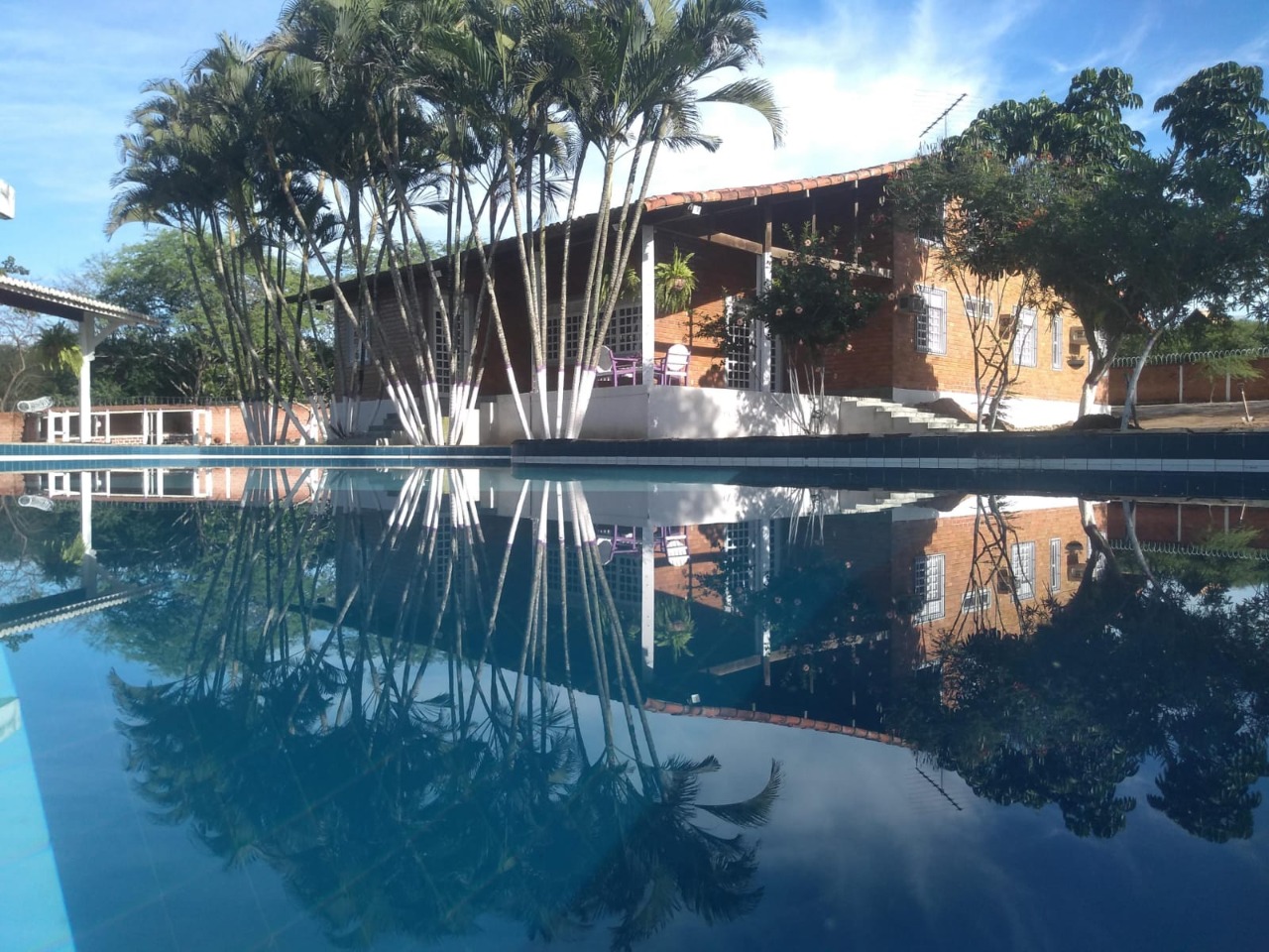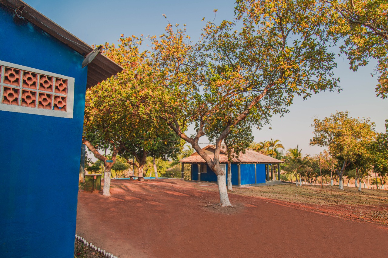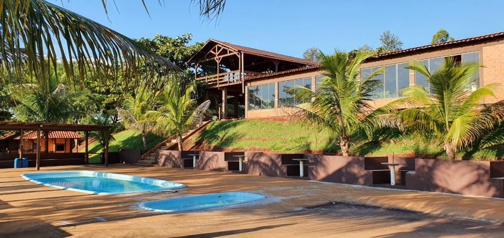 Ambientes equipados com piscina, academia, campo e quadra para esportes, refeitório, além de uma área ampla.